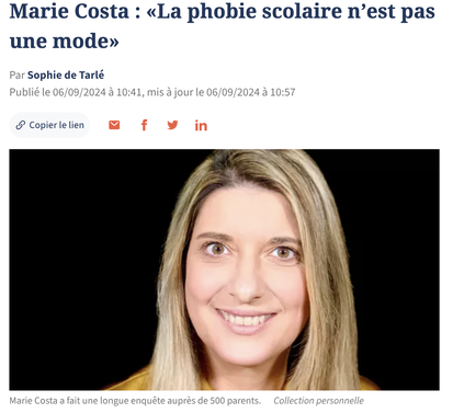 Marie COSTA.- J'ai enseigné durant 27 ans, de la maternelle aux classes préparatoires. Aujourd'hui je me suis reconvertie afin d'accompagner des parents et des adolescents en difficulté ou qui ont des troubles du neuro-développement. Il s'agit de jeunes qui sont en opposition, en confrontation, ayant des conduites à risques. Un jour, une directrice, qui est aussi enseignante, m'a demandé de faire une formation sur le refus scolaire anxieux pour aider ses professeurs à mieux le comprendre. Et j'ai souhaité dans ce livre aider les familles et les enseignants à repérer et décrypter ce phénomène.